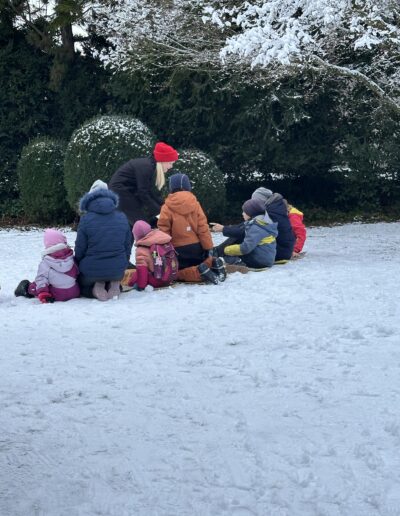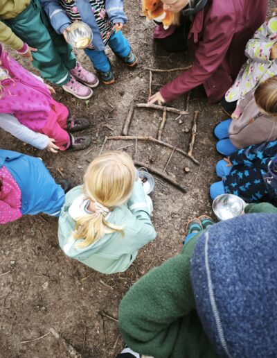Der gemeinsame Morgenkreis bildet den festen Startpunkt des Tages. Wir besprechen das Programm und stimmen uns auf die gemeinsame Zeit ein. Der Kern unseres Tages ist das Lernen und Entdecken Outdoor, im Wald oder an anderen schönen Plätzen draussen. Die Kinder haben anschliessend Zeit beim Fachinput neue Fertigkeiten zu erwerben oder bestehende Kompetenzen auszubauen. Daneben gibt es aber genügend Freiräume für die Beschäftigung mit vom Kind selbstgewählten Aktivitäten und freies Spiel. Feste Rituale wie der gemeinsame Znüni strukturieren den Vormittag und schaffen Momente der Gemeinschaft. Je nach Stundenplan folgt nach Abschluss des Morgens ein gemeinsames Mittagessen und Nachmittagsaktivitäten.